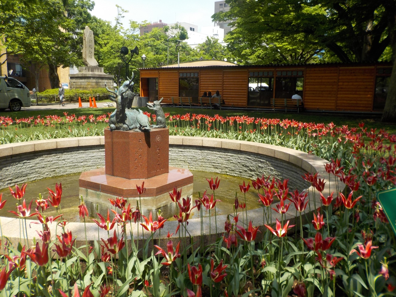 大通公園には色々なオブジェやモニュメントがあちこちにありますが、この記念碑は長細い公園のちょうど真ん中あたりにあって、かなり大きく目立っています。石に刻まれた力強い大きな字は、開拓という事業がいかに大がかりで大変な作業だったのかを表しているような気がしました。