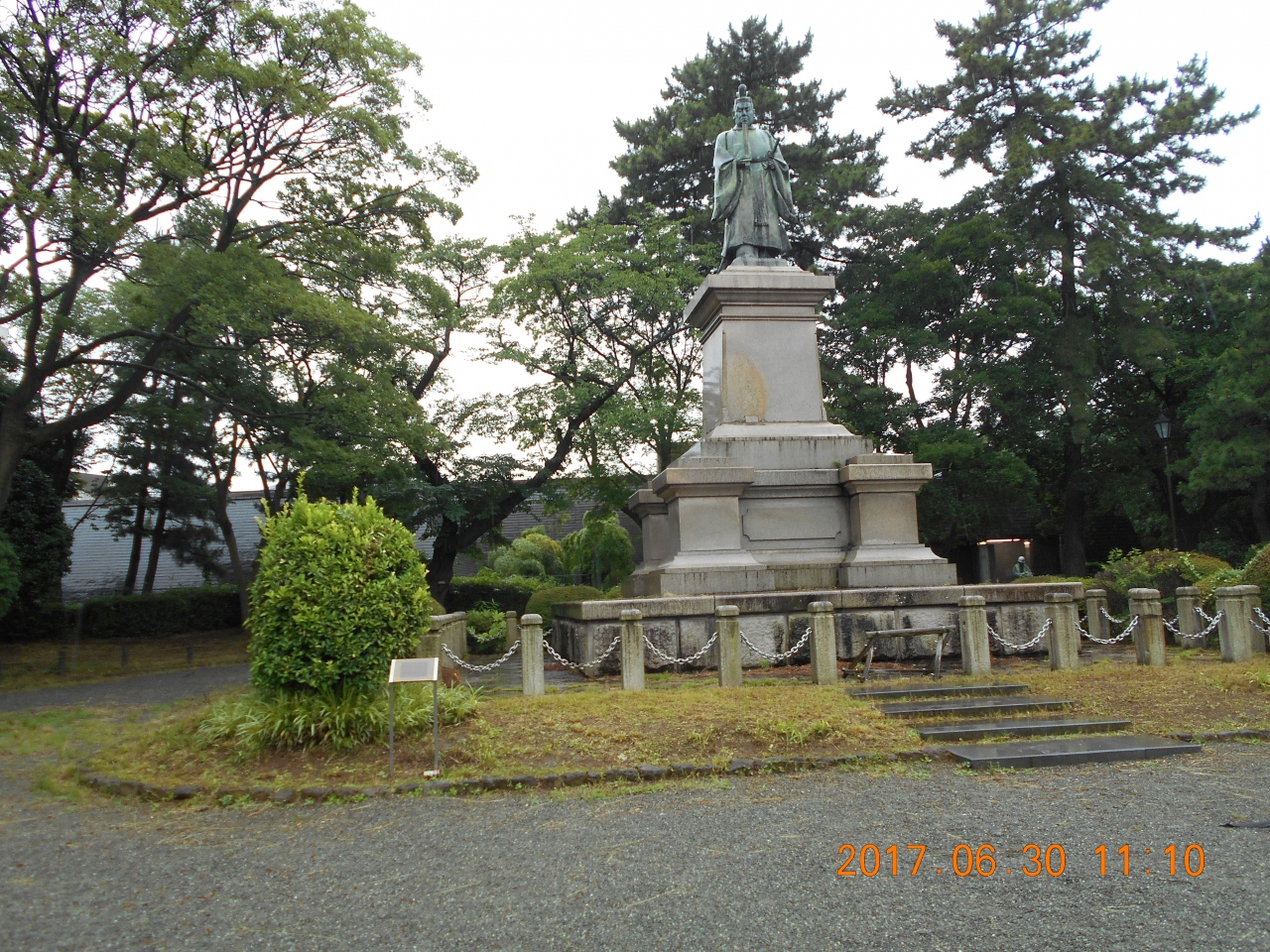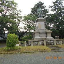能楽堂の横の階段を上がっていくと 開けたところに出ます。そこには とても高い台座の上に立つ正装をした井伊直弼の銅像が海に向かって立っています。
