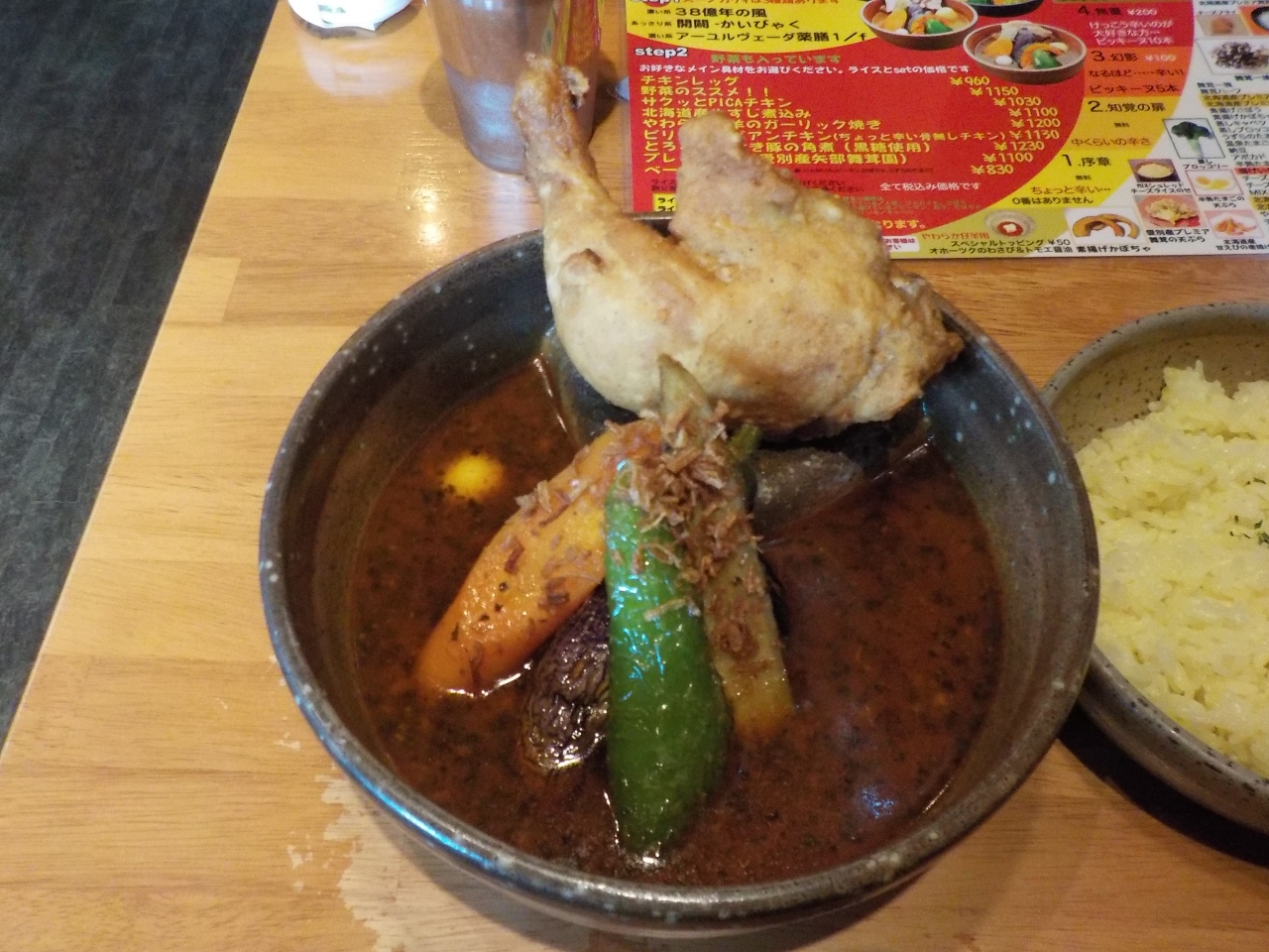札幌のスープカレーの店を何件か食べ歩きましたが、この店が一番のお気に入りです。スープは味と辛さを選べ、味は濃い系で辛さは中ぐらいの2にしました。出てきたスープカレー、野菜がたっぷりですね。それにカリッとしたチキンから揚げがスープと良く合います。大満足のスープカレーに出会えました。