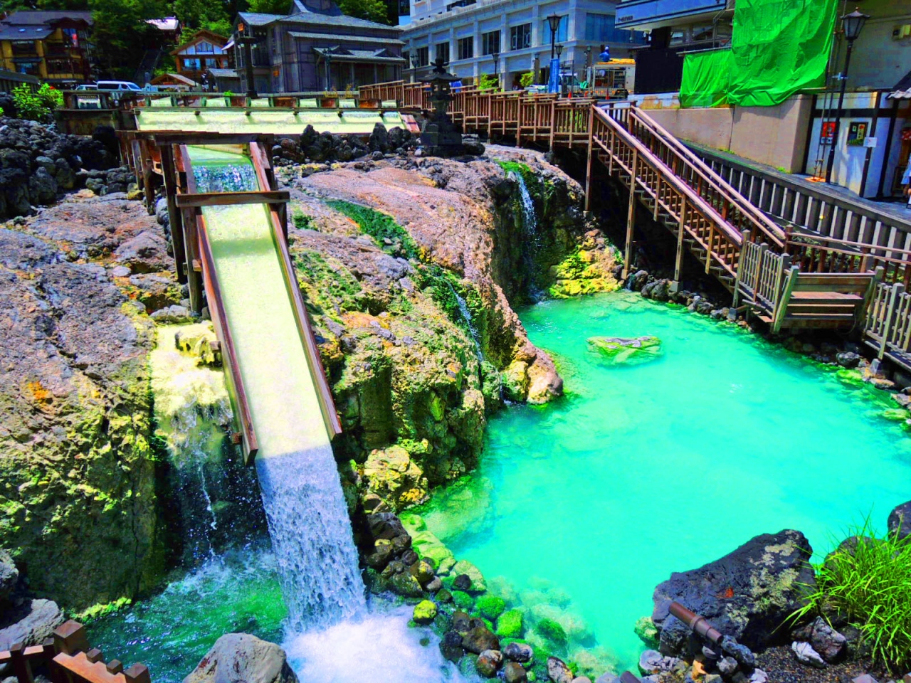 エメラルドグリーンの湯畑、非常にキレイでした。