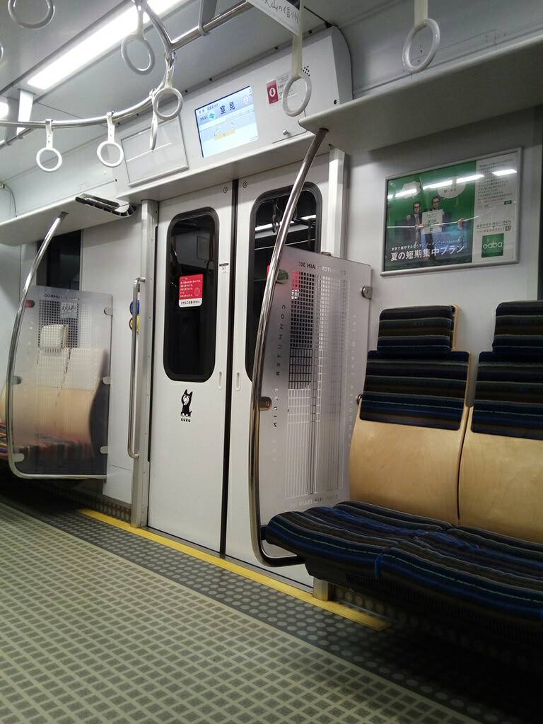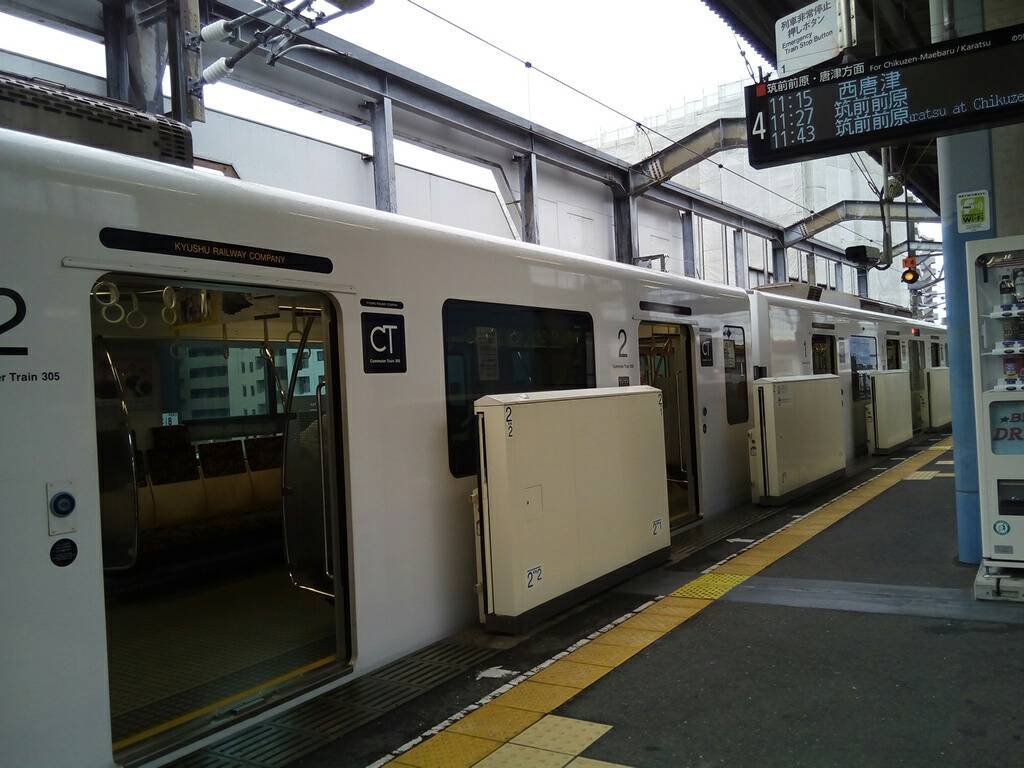 たまたま乗った車両がJRの新しい車両でした。お洒落でシートに木が使ってあったり、床がQRコードがちりばめられたデザインだったり、ドア部分にJR九州のゆるキャラのクロちゃんが描かれていたりで可愛い車両でした。