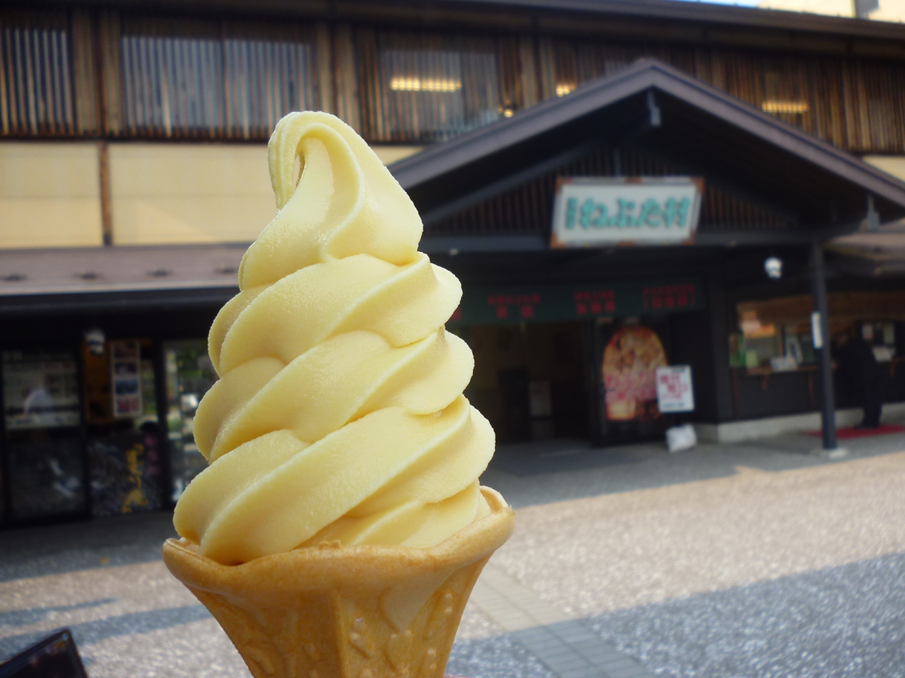 津軽藩ねぷた村で、大きなねぷたを見学して津軽三味線の生演奏を聞いて、出口を出ると、「りんごソフト」がありました。色々なソフトクリームを食べてきましたが、りんごソフトは初めてです。ほんのりと黄色くて、リンゴの酸味がおいしかったです。