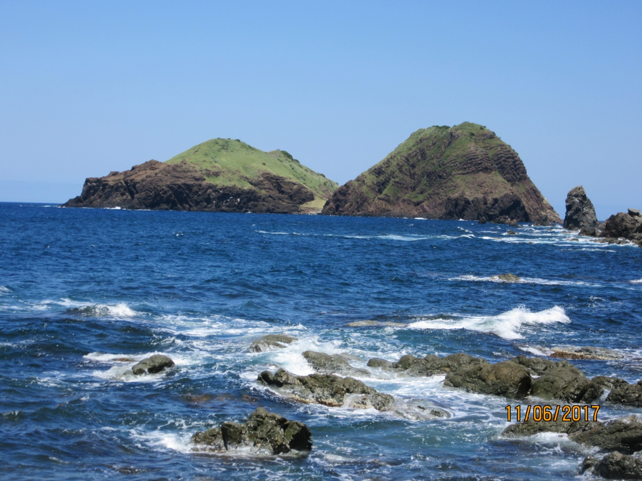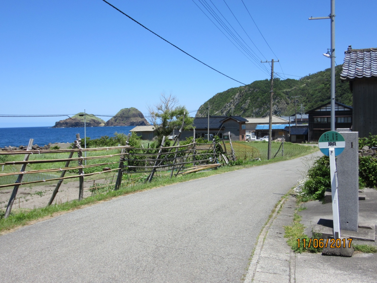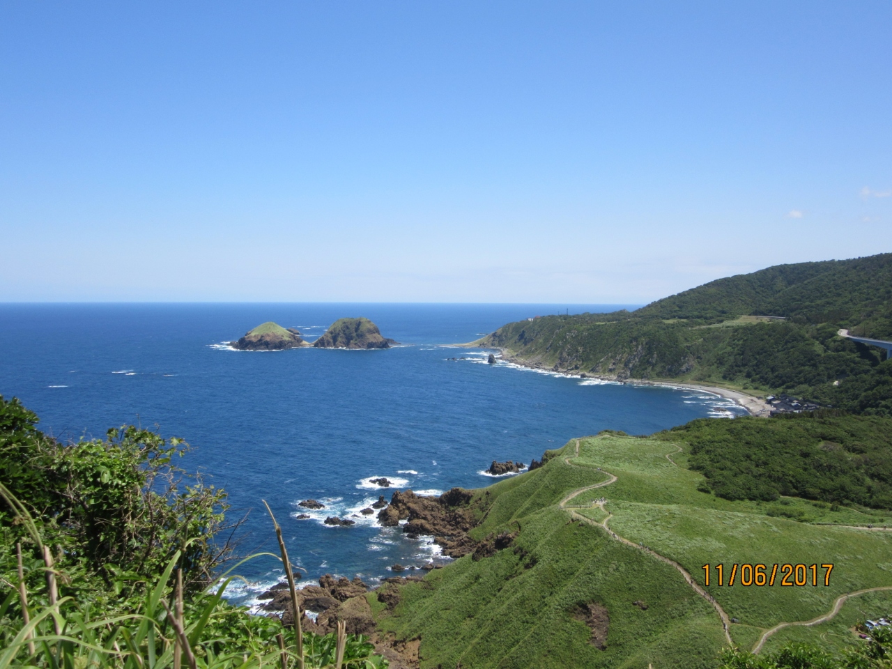 大野亀から徒歩で【願】の集落に降り海岸の遊歩道を向かいました。大野亀、願の集落、遊歩道からは二つに見えますが、近くになると一つに見えます。またビューポイントの