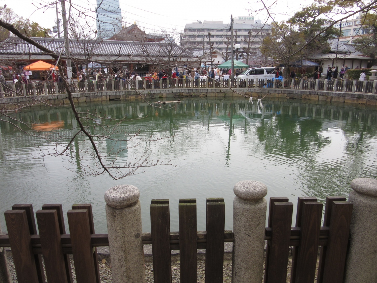 四天王寺の北鐘堂の裏に丸池があります。別名鏡の池と言います。名前の通り丸い池でした。亀が本当に多いなあと思いました。太平洋戦争の時の丸池のお陰で北側にある建物は焼失から守ることができたと解説の看板に記載されていました。