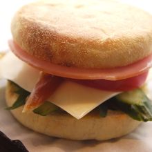 パンの間に守口漬、大葉、キュウリ、チーズ、トマト、ハムを挟むという、和洋折衷のサンドウィッチ。
