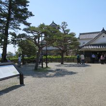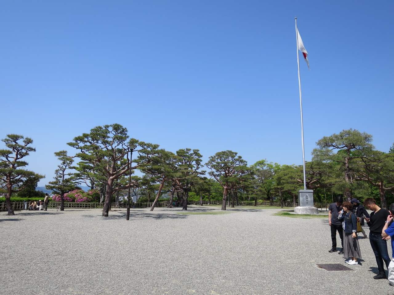 高知城 詰門を右から回り込むように上った広場が二ノ丸です。現在は何にもない広い広場ですが、かつては二ノ丸御殿、家具櫓、数寄屋櫓があり広い理由が分かります。ここから詰門2階の渡り廊下を渡り、廊下門を潜って本丸に入れる様になっています。そのため二ノ丸からは詰門、廊下門、天守を一つのアングルに収めて撮影することができます。