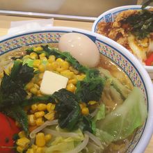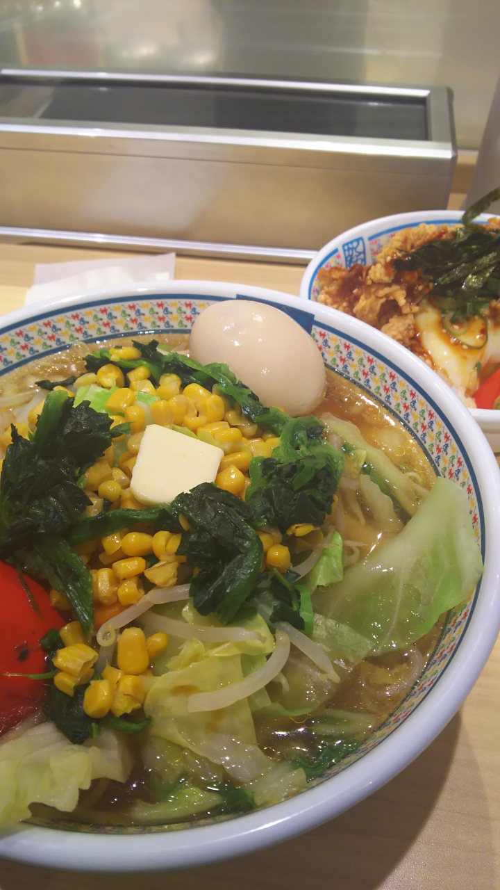 いつもはおいしいラーメンのセットを頂いているのですが、今季は季節限定ラーメンを頂きました。野菜とバターのおぴしいラーメンです。バターが溶け出し手の甲になって美味しかったですね。もう少しバターの量が多いと良かったです。から揚げ丼とは相性良かったです。