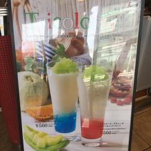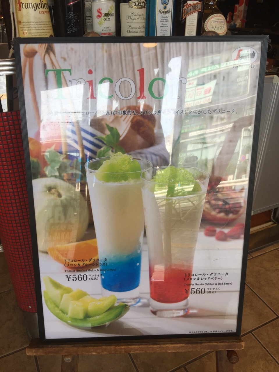 暑い日の御墓参りのあと、電車に乗る前に一休みしてコーヒーでもと思い、入ってみました。入ったとたん目に入ったのが、三色の美味しそうな飲み物でした。早速その冷たそうなのを注文しました。やはり正解、とても美味しかったです。上の方にマスクメロンのゼリーとマスクメロンを切ったのがのせてあり、贅沢な気分になりました。また夏のうちに飲みにいきたいです。