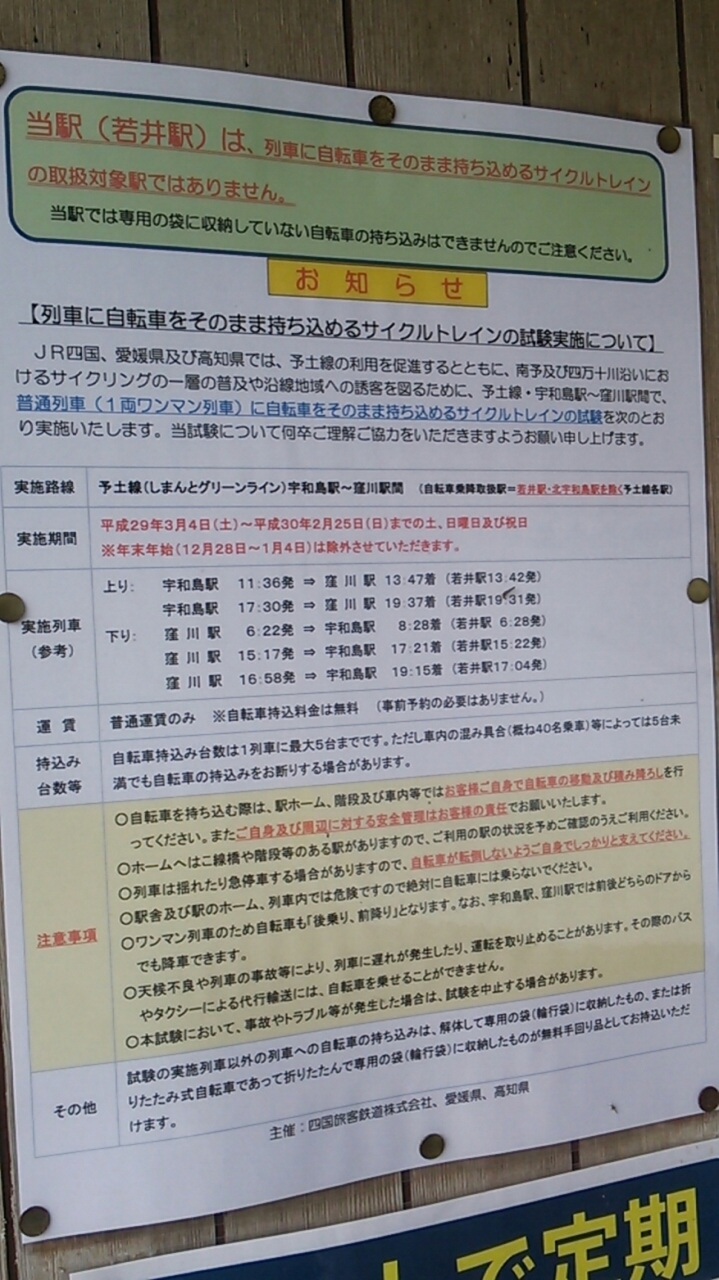 対象となる列車は宇和島11時36分発と17時30分発の窪川行きと窪川6時22分発、15時17分発、16時58分発の宇和島行きの列車で、1列車につき最大5台持ち込みが可能だそうです。