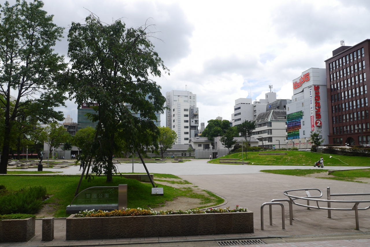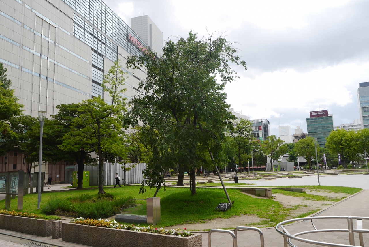 天神の一等地にあり、西鉄駅、三越、ソラリアプラザなどの囲まれた公園です。