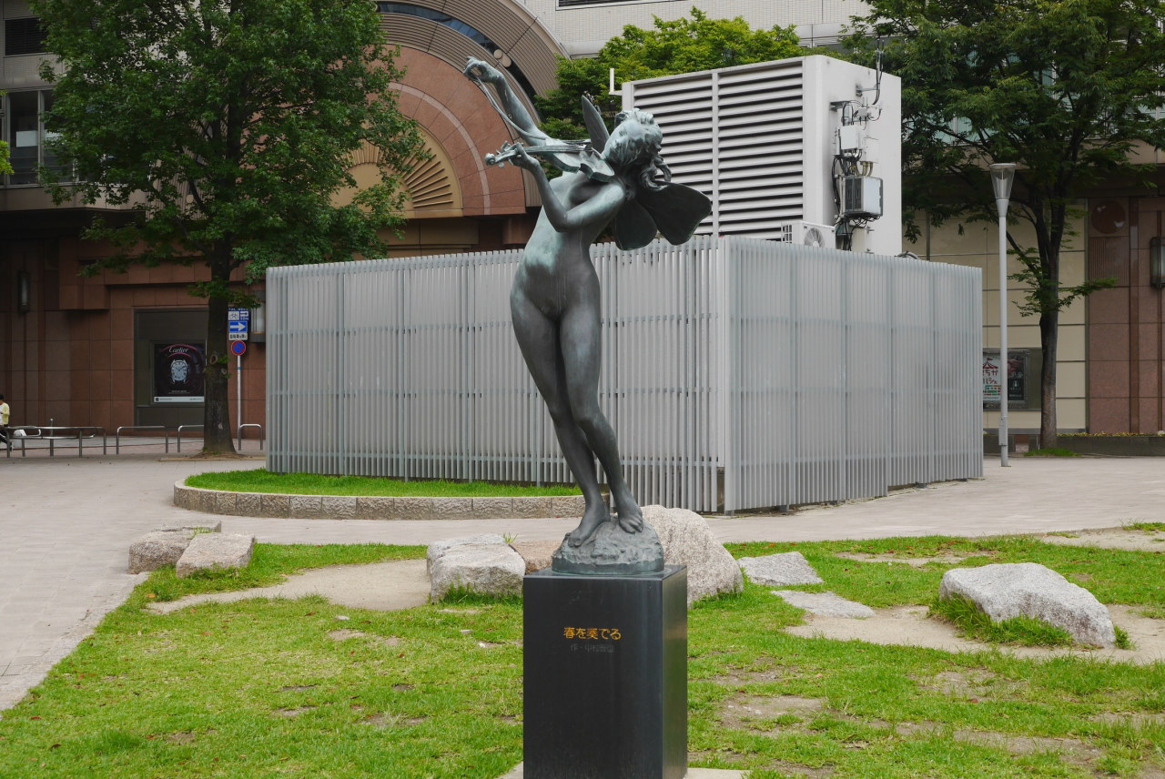 ビルの中から一歩出ると広い公園で、緑は少ないですが銅像が置かれ、ベンチ代りになる石組みなどがあります。全体に高低差が余りなく、公園と言うよりも広場の感じがします。