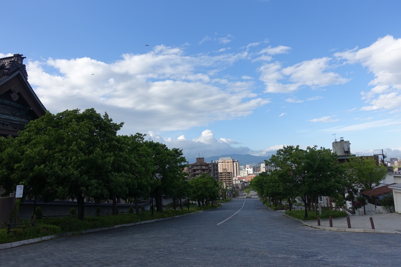 函館市電の十字街駅を降りて、函館山ロープウェイ乗り場に行くときに、この二十間坂を上りました。石畳のようなきれいな坂で、坂の下からは函館山を見上げることができ、坂の上からは函館の街とその奥にある山がきれいです。