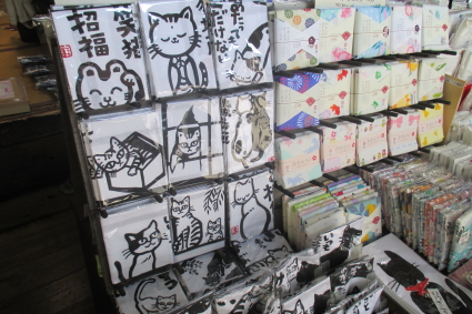 にび堂は、大正浪漫夢通りの南端の交差点を西に入り、旧鶴川座(ほぼ廃墟状態ですが・・・)の前にあります。ガラス戸を開けて中に入ると、真面目そうなご主人が、修行僧の様に正座をして身じろぎ1つしません。お店の壁の模様になったみたいです。それはともかくとして、猫の切り絵ふきんが可愛かったので買って帰りました。1枚400円です。