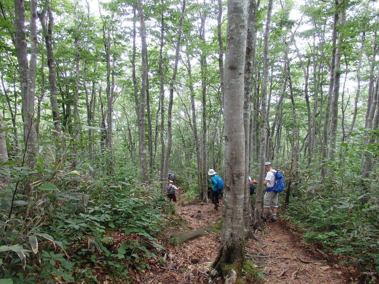 磐梯山の登山口として有名な八方台登山口を出発し、少し急な登りのブナ林を登る。緑がきれいなブナ林である。小さなアップダウンを3回繰り返し1時間20分後猫魔ケ岳山頂(1403.6M)に到着。残念ながら曇っていて、期待した展望はありません。下山は雄国沼方面に下る。綺麗なブナ林を通過する。小さなアプウダウンを繰り返し下る。雄国沼を通って、出発後4時間後金沢峠に到着。本日のコース、標高差はあまり無く、歩き易いコースでした。曇りのため、山頂からの展望はありませんでしたが、野花が20種以上見られ、満足できるコースでした