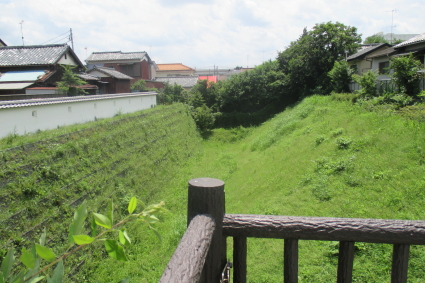 中ノ門堀跡は、市役所前交差点から東へ200m少々の右手にあります。郭町交差点の70~80m手前です。ここに川越城の中の門にあった堀が残されています。住宅街に囲まれた中に突然大きな穴が開いているといった雰囲気です。ここは城内へ攻め込んできた敵の侵攻を止める仕組みです。城内に造られた深さ7m、幅18mの空堀ですが、さらに堀の法面の角度が異なります。城の外側は30度なのに、内側は60度なのです。60度では人はもう登れませんよね。