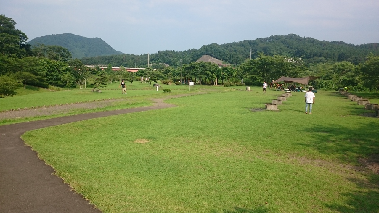 キャンプ、バーベキュー、釣りなどを楽しむ人がいる公園です。芝生広場というと、みちのく公園のように大勢の人で混雑しているイメージがありますが、ここは穴場で人も車も少ないです。スラックラインなど、思い思いに遊んでいる人たちがいました。ダムの湖面近くまで車で降りている人がいたので、どこからか入れるのでしょう。