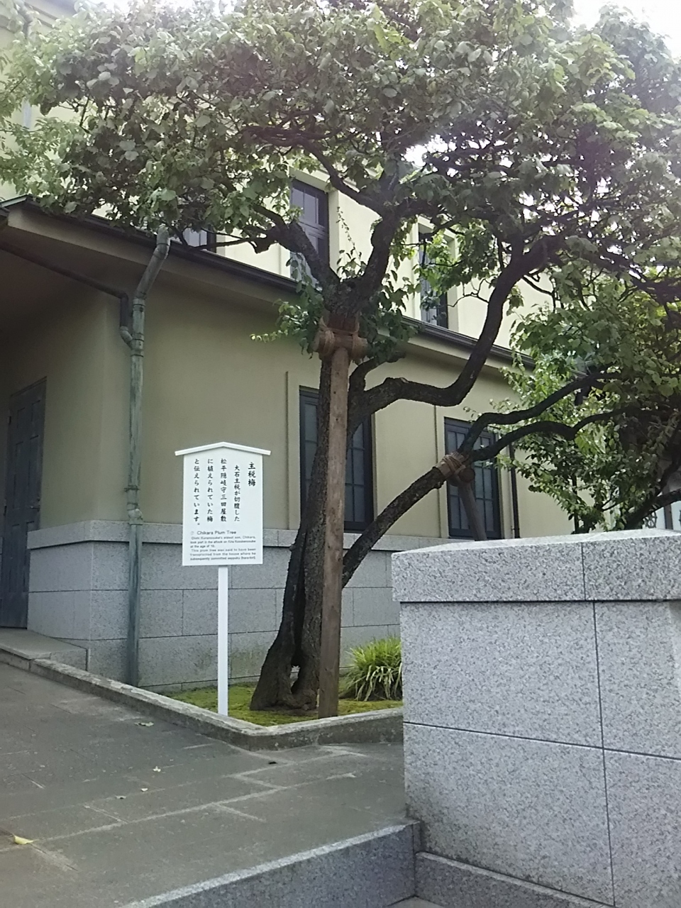 赤穂浪士討ち入りの中の大石主税が家入の果てに切腹をした松平隠岐守の藩邸にあった梅を弔うためにこちらに移植されたという言い伝えのある梅の木です。 大石内蔵助の息子としてもよくテレビは小説で必ず登場する人物ですので、こちらの木に手を合わされてる方もたくさんいらっしゃいます。