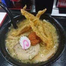 味噌ラーメンに味の深みを出す辛味噌のスープ。そのスープを吸ってもカリカリしているゲソ天。