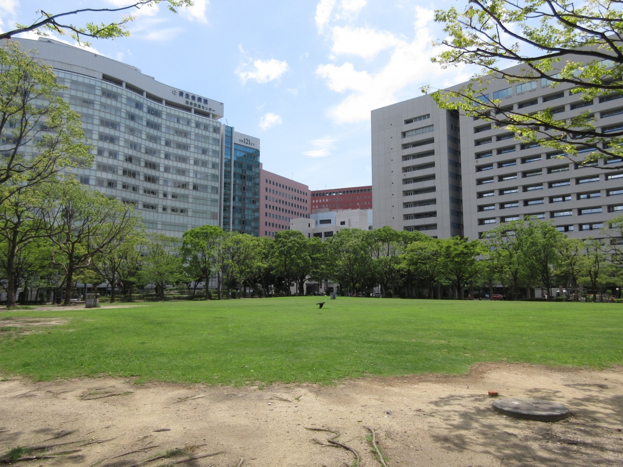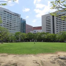 広い原っぱでは、ランニングや体操、昼休みになれば、近くの会社員がお弁当を食べにきます。