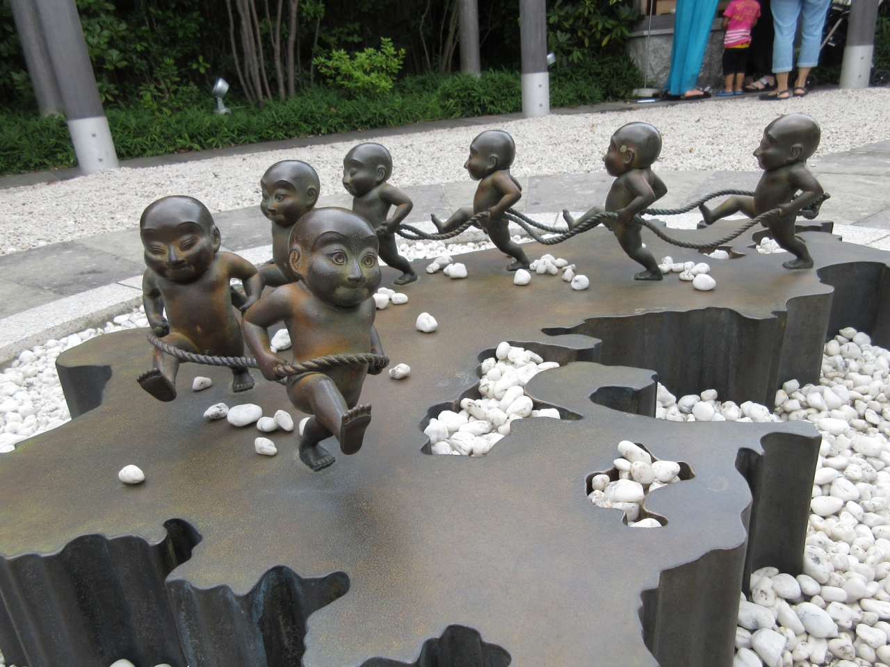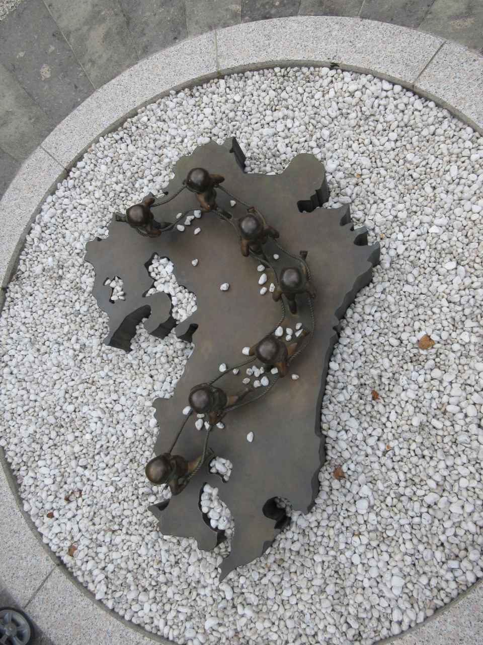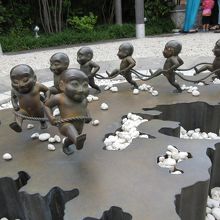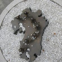 九州の上を小人たちが輪っかを持ち「線路は続くよどこまでも」のようなオブジェ、かわいいですよ!