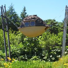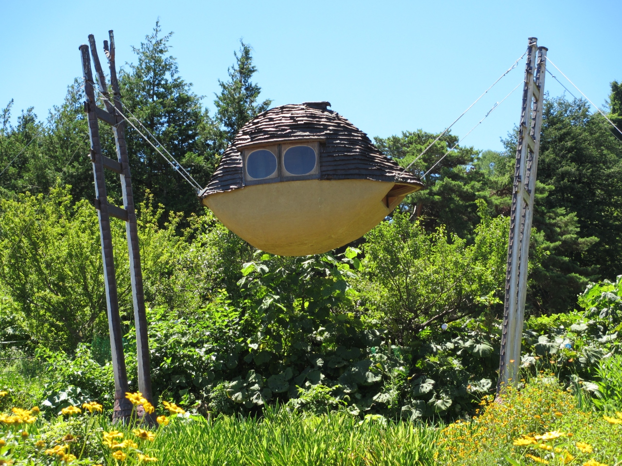 茅野駅から車で10分ほどのところに建つ神長官守矢史料館を訪れた際、近くの草地に浮かんでいるのを見つけました。宇宙船のような形をしていて、あまり訪れる人が多くない場所に建っているのがとても不思議でした。何のために建っているのかずっと気になっていたのですが、最近になって高過庵と空飛ぶ泥舟いうものであることを知り調べたところ、茅野生まれの建築家・藤森照信さんが製作した茶室であることがわかりました。中がどうなっているのかわかりませんが、奇想天外な建物だと思います.