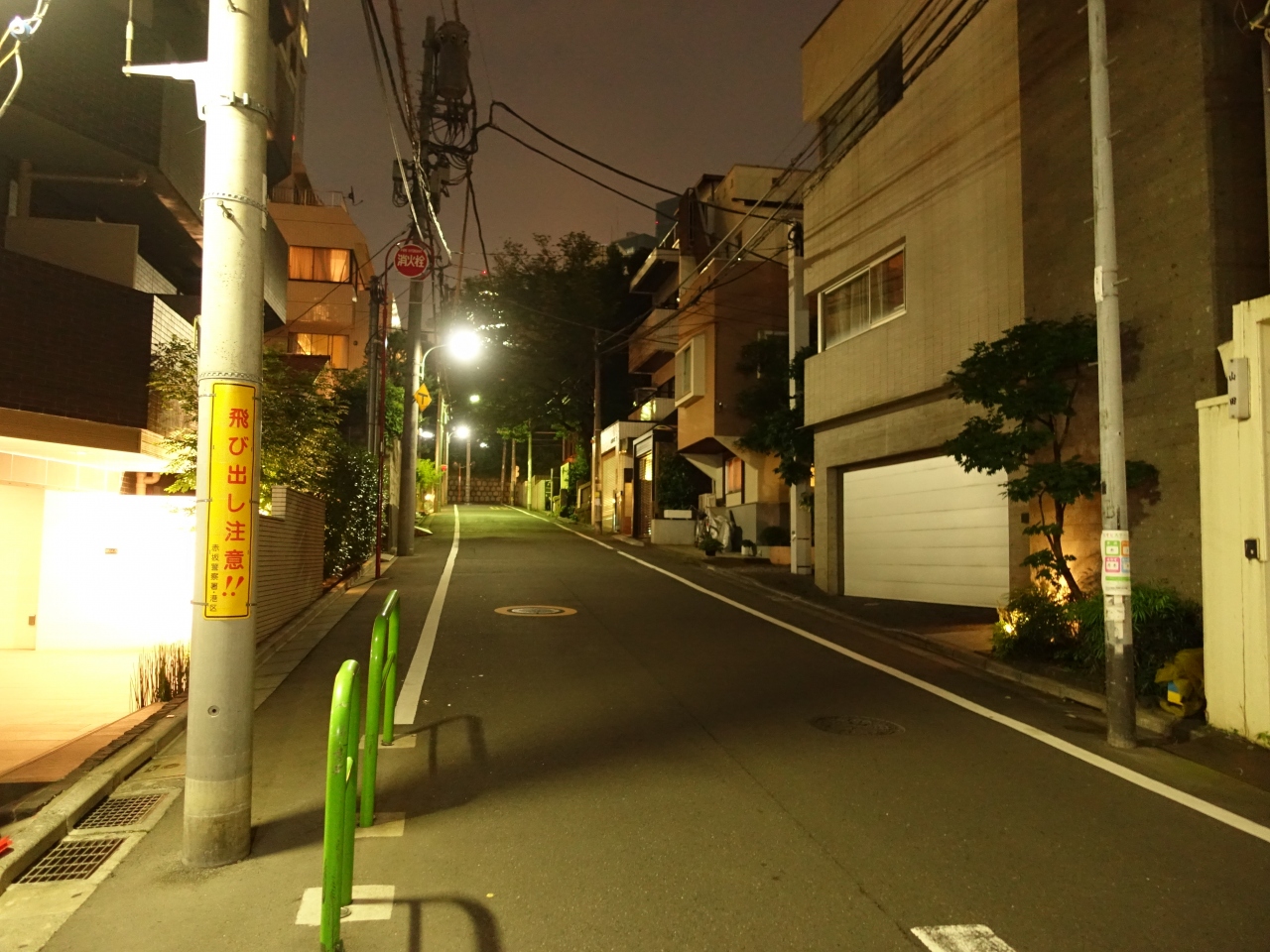 夕食後に氷川神社に参拝したあと、宿泊先の赤坂のホテルに向かう途中、氷川坂を通りました。昼間でもあまり車も人も通らない坂ですが、夜は更に静けさを帯びており、ゴーストタウンのようでした。ここが六本木と赤坂という港区の中心であることが信じられないような光景でした。