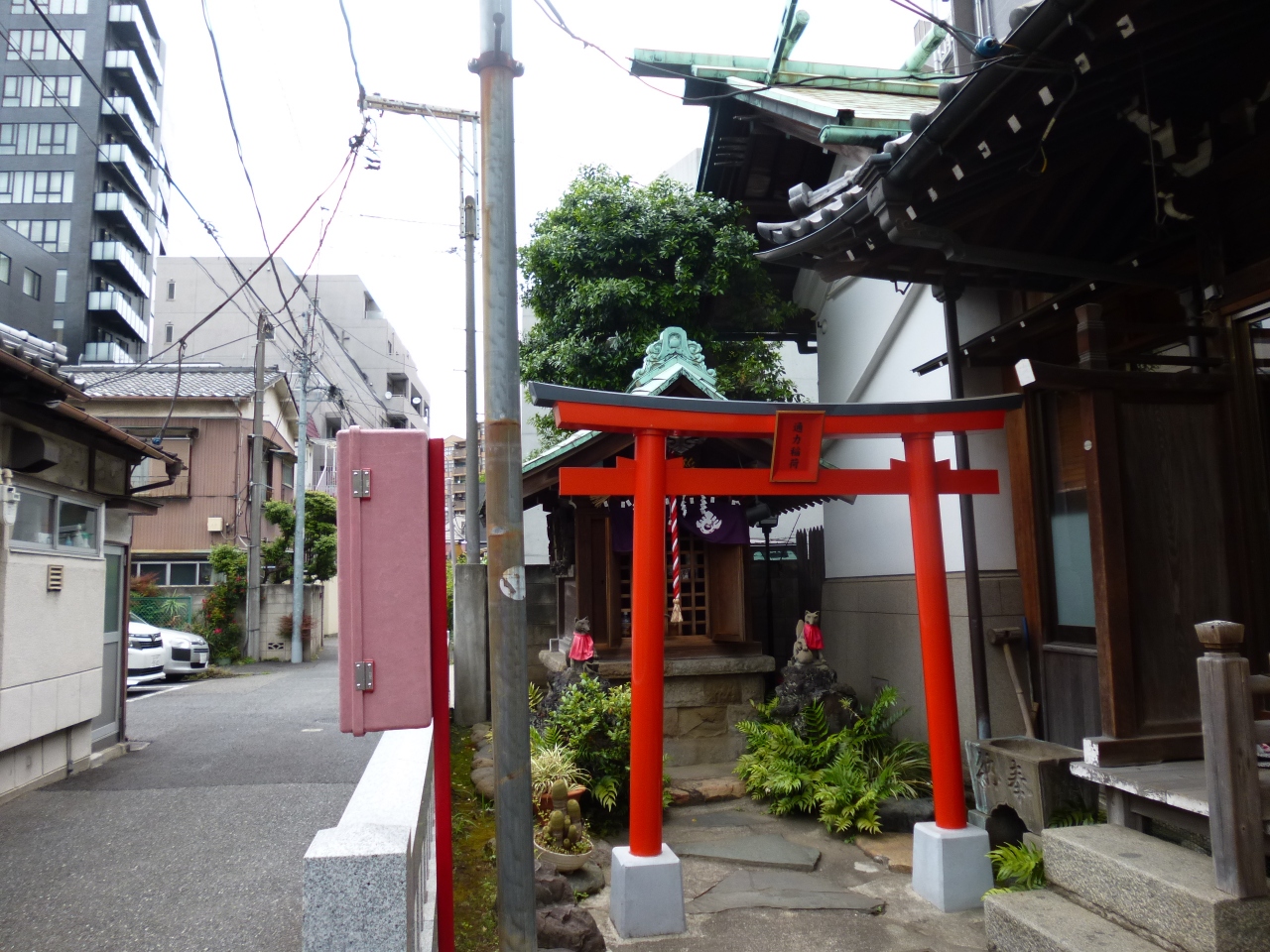 高輪の泉岳寺と桜田通りの間には、沢山のお寺があります。神社はそれほど多くありません。広岳寺の近く、神社自体は、鳥居が敷地の内側にあってわかりにくいですが、同じ境内にある、通力稲荷の赤い鳥居が目印になります。広くはありませんが、落ち着いた雰囲気の境内です。