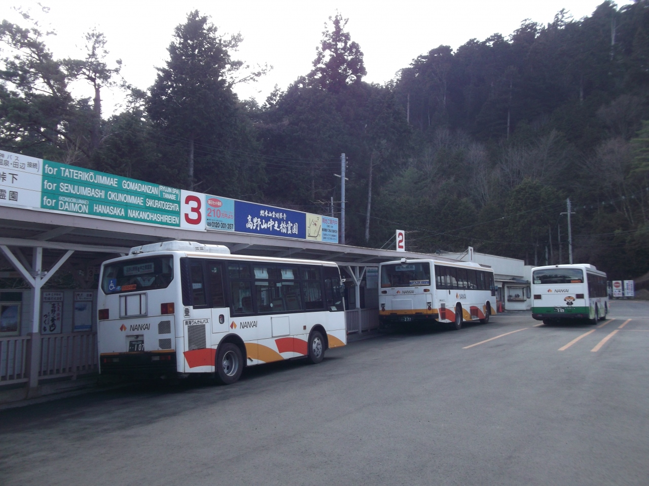 ケーブルが高野山に着くと駅の前にバスが待機していました。ケーブルの到着時間に合わせて発車するので、待ち時間のロスがなくて便利ですね。このバスは高野山の街中も走っていて、金剛峯寺、奥の院の間などを移動するのにも便利です。路線によっては便数が少ないので注意が必要ですが、帰りのバスもケーブルに連絡していて便利でした。