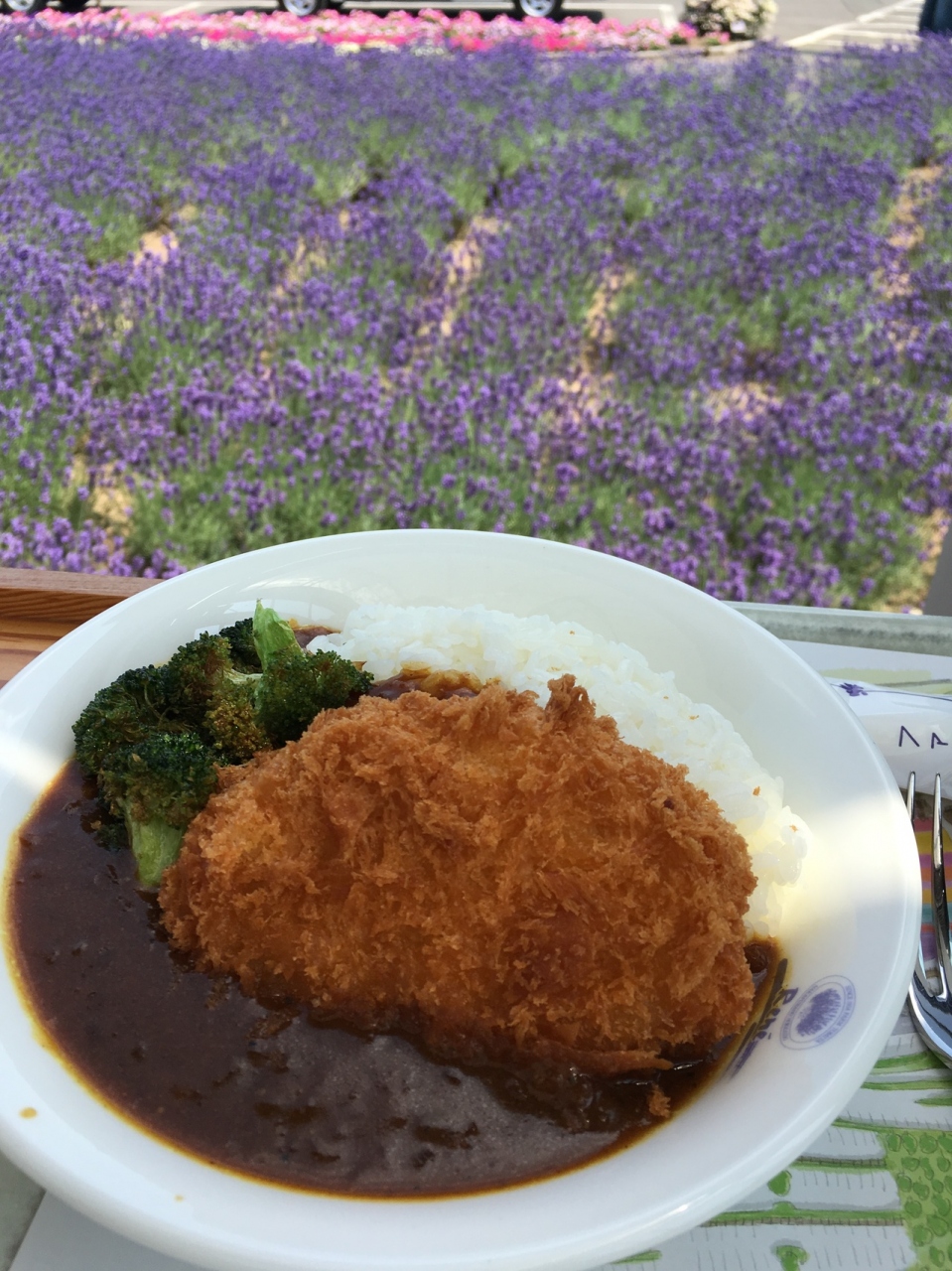 ファーム冨田内のカフェテリアで、メニューは甘口か中辛を選べるカレーにソーセージやじゃがいも、コロッケ等のトッピングをしたもの、男爵とメークインの蒸しじゃがいも、ホットドックなど。カウンター席からはラベンダー畑を臨みながら食事ができます。ラベンダー期間中のお昼時は注文までに20分ほど並びましたが料理の受け取りはスムーズでした。