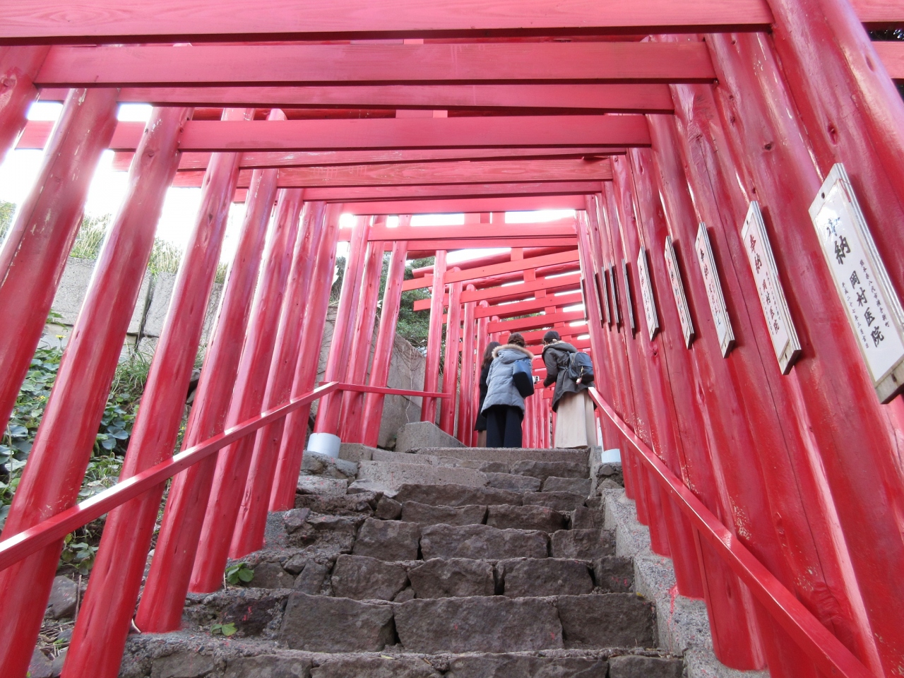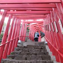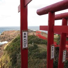断崖絶壁の上に立つ、たくさんの赤い鳥居。その数は優に100本以上。