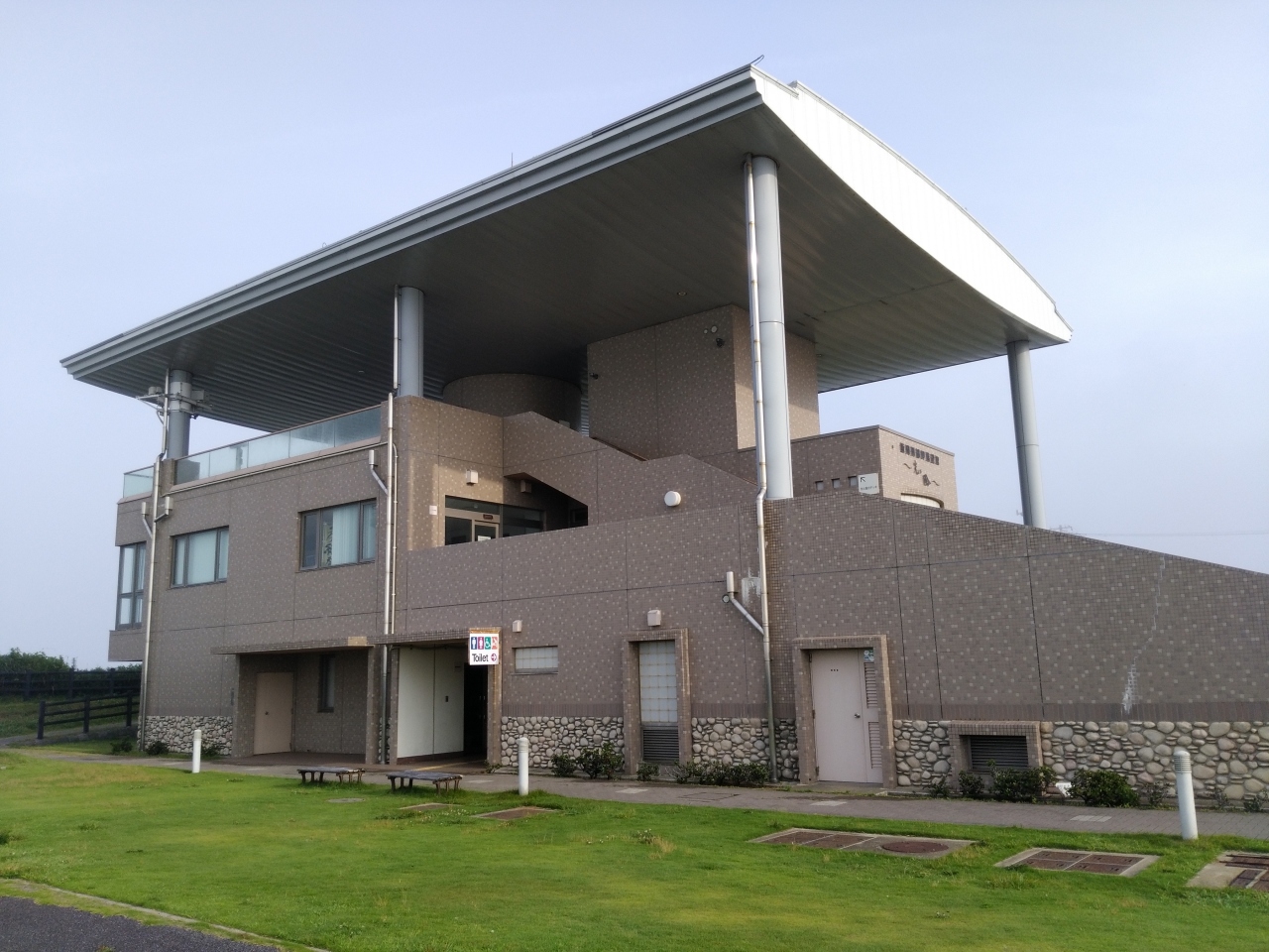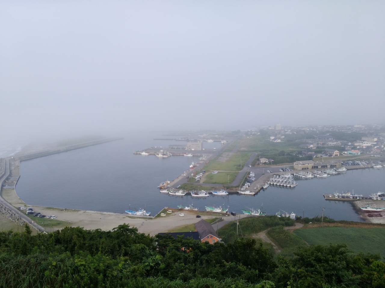 飯岡漁港を見下ろす高台の刑部岬の上にあります。飯岡刑部岬展望館です。岬の上に立派な展望所があり、開放的なデッキから飯岡漁港を見下ろせます。もちろん太平洋を一望です。当日はちょっともやっており、眺めはいまいちでしたが、吹く風はさわやかでとても良い場所でした。駐車場は広大に完備。トイレもあり。道中の一休みにはちょうど良い場所でした。
