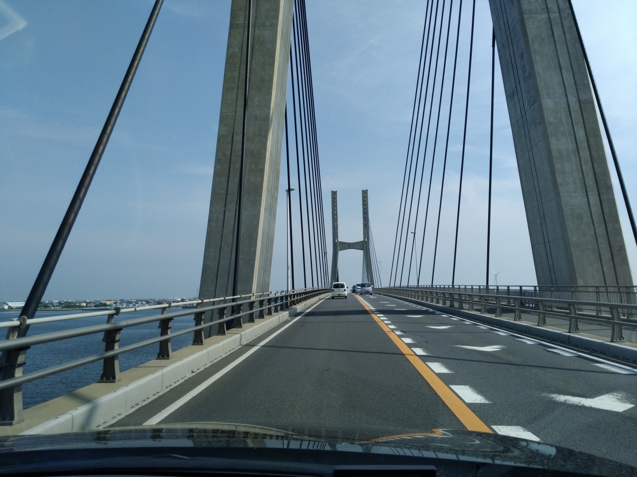 千葉の銚子から茨城へ。利根川河口の広い川幅を渡す銚子大橋です。銚子の町中から橋にかかると景色が一気に広がります。下は利根川の広い川幅。下流は太平洋につながります。道幅はそんなに広くないのと、周りの景色が良いので、運転には注意が必要ですね。