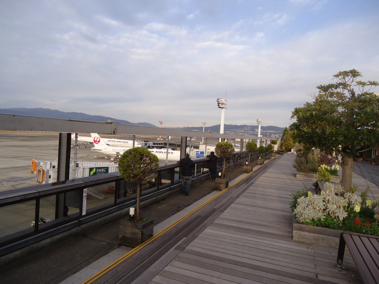 伊丹空港の4Fにある展望デッキです。ウッドデッキで花壇なども整備されているし、飛行機がよく見えるようにちょっと高くなっている場所もありました。いろいろな空港の展望デッキに行きましたがここはのんびりするにはよいところだと思いました。離発着も多いので見ていてあきないと思います。