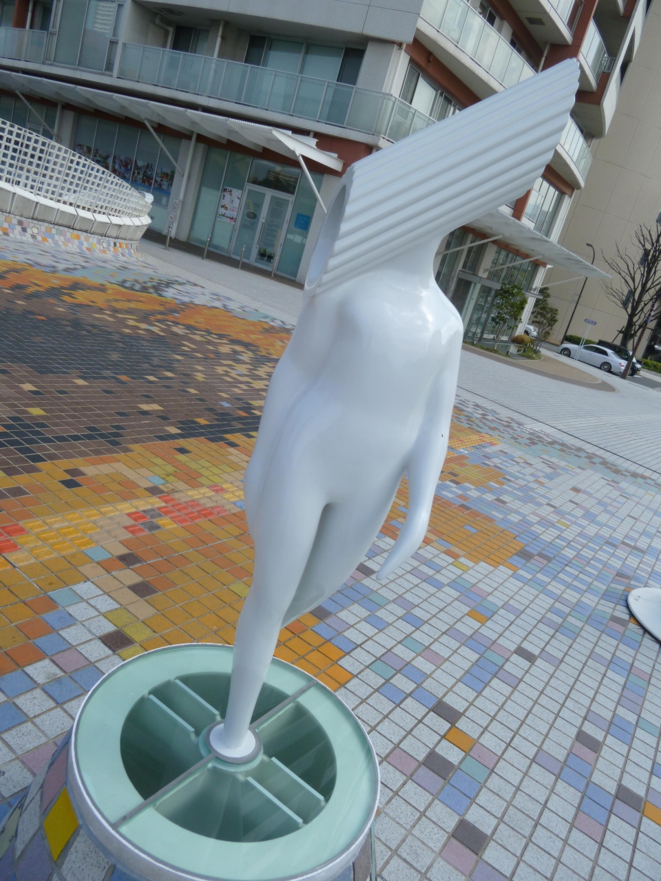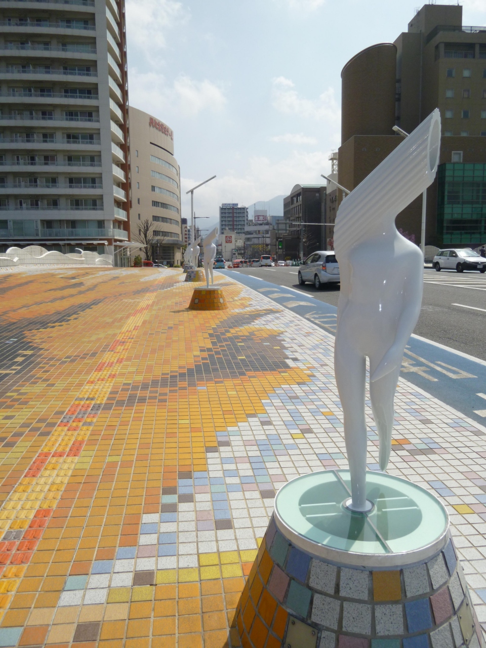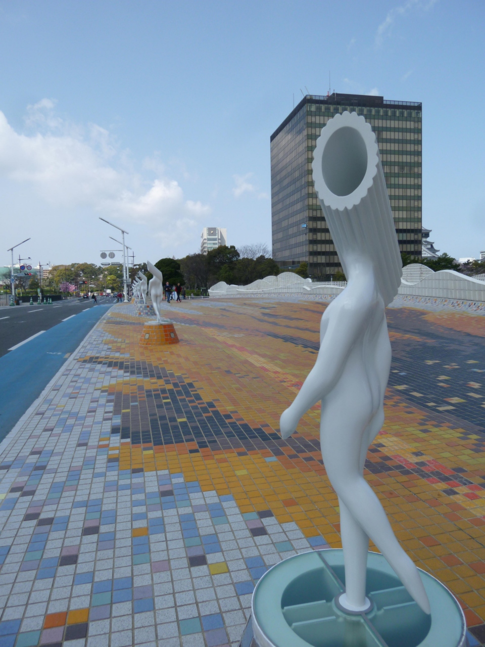 橋自体も暖色系のタイルで装飾されていて見た目にも軽快な感じなのですがその歩道には先程のマカロニマンが・・・・