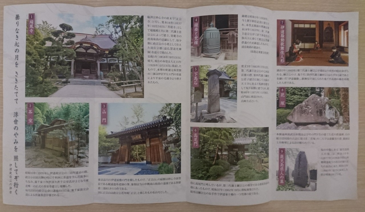 広くはないが、鐘楼もあり。拝観は無料。パンフレットは賽銭場の手前に立て掛けてあった。また賽銭箱の右手に梵鐘も。瑞鳳殿へ行く際はゼヒ立ち寄ってみるべき。