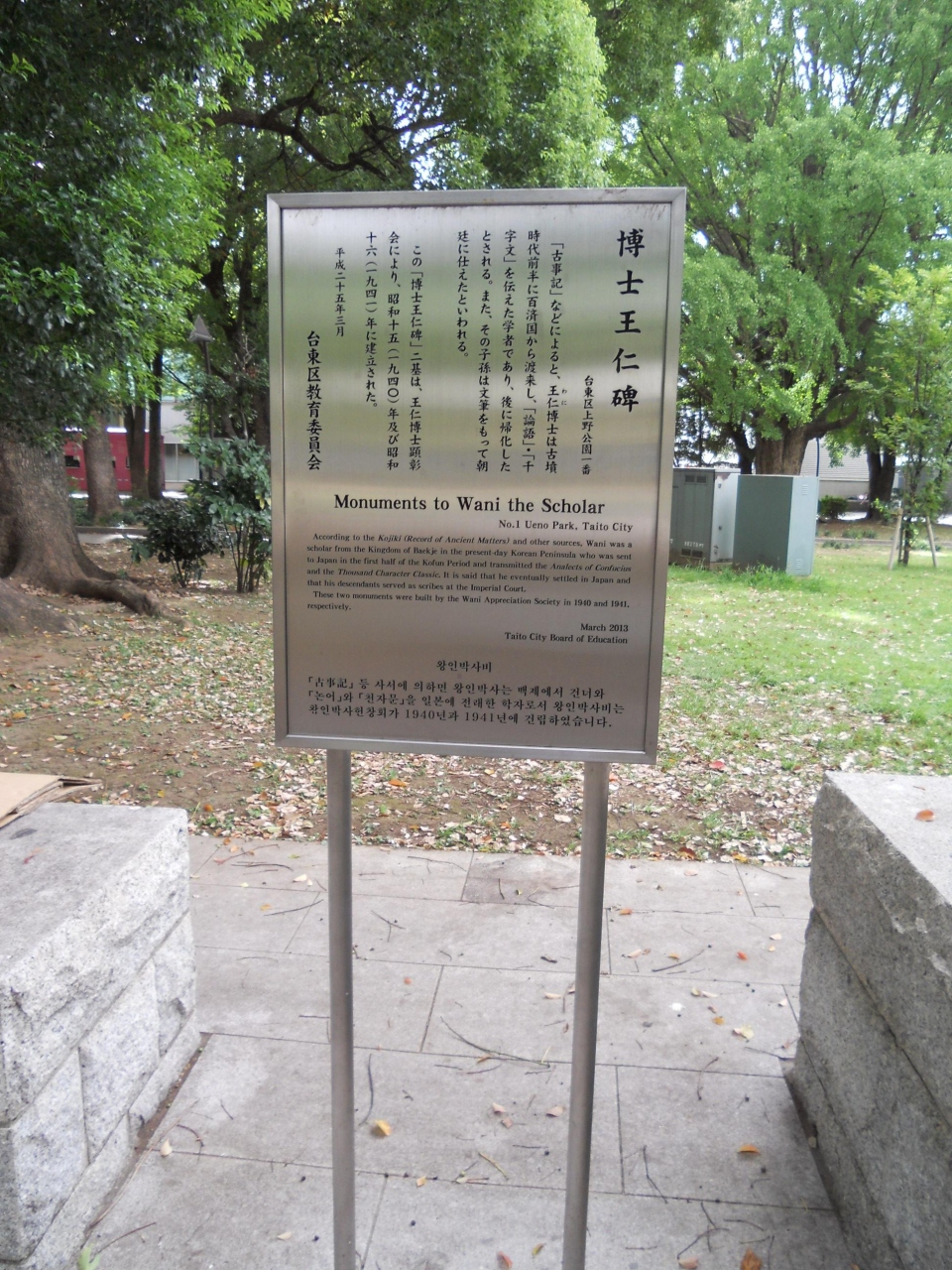 ニューカレドニアから帰国後、主人を先に帰して、上野広小路のホテルに後泊したので、翌日に早朝から「上野公園」をお散歩した際に、偶然発見したのがこちらの「王仁博士碑」でした。