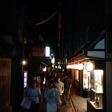 鴨川にかかる四条大橋のすぐ近くに有る小路です。細い通りですが石畳で風情が有ります。昼間は観光客で、夜は食事や夜遊びの人々で賑わっています。この日は近くで夕食をとり、その後友人たちと先斗町をふらふら散歩していました。