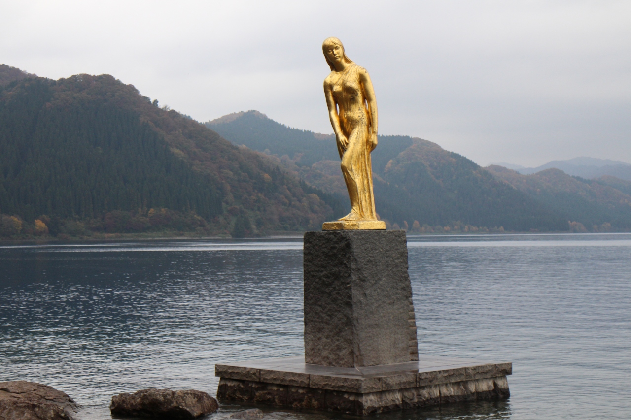 レンタカーで一周回り その後 田沢湖のシンボル「たつこ姫の像」のある場所で写真タイム