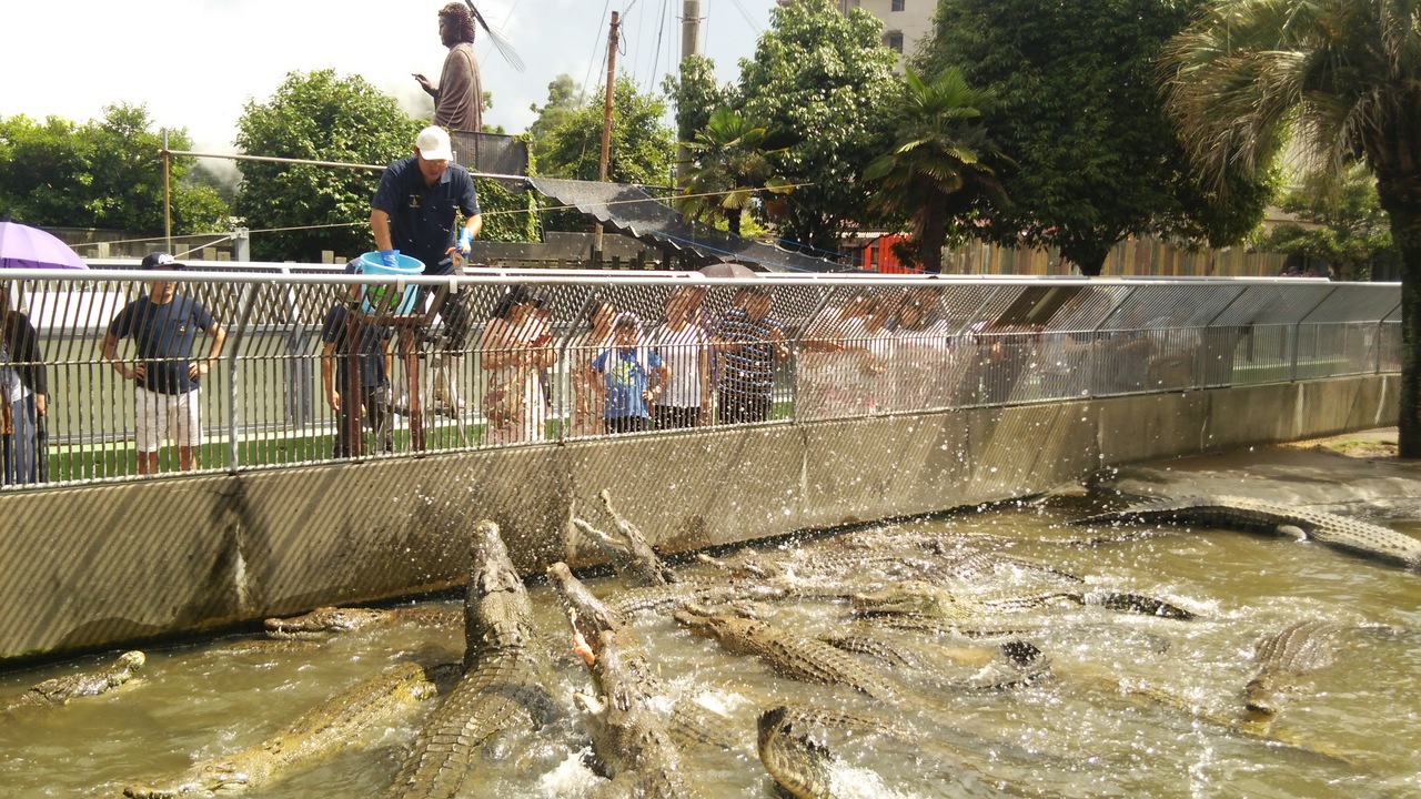 午後2時半から餌やりだと聞き、それに合わせていきました。ワニは大きいですね。ふだんは動きが鈍いですが、餌やりが近づくと段々動きが活発になりました。鶏肉や馬肉をスタッフがあげると、一口で平らげていました。とても迫力がありました。