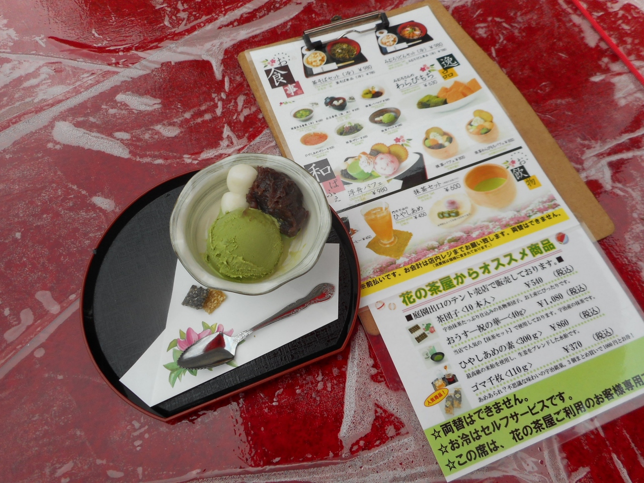 5月に三室戸寺に行きました。境内は広大でツツジやしゃくなげの咲き誇る参道を廻って疲れた所に現れた茶屋です。東屋のような小屋と赤い大番傘の茶席が3,4席あるだけですが疲れた身体を癒すには十分。花の中でお茶をするという最高の雰囲気が味わえました。