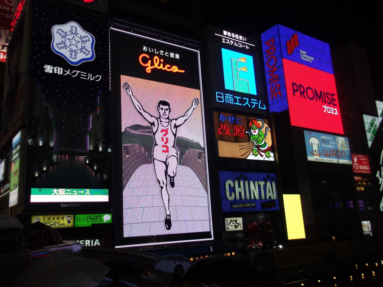 昼も賑やかな道頓堀ですが、日が落ちてネオンの灯りが目立ちだす頃になると、一層華やかな雰囲気で満ちあふれてきます。おなじみのグリコの看板やかに道楽の巨大かに、ドンキの観覧車など、見ているだけでも心がうきうきしてきます。騒がしいところはあまり得意ではありませんが、ここはやっぱりこうでなければいけませんね。
