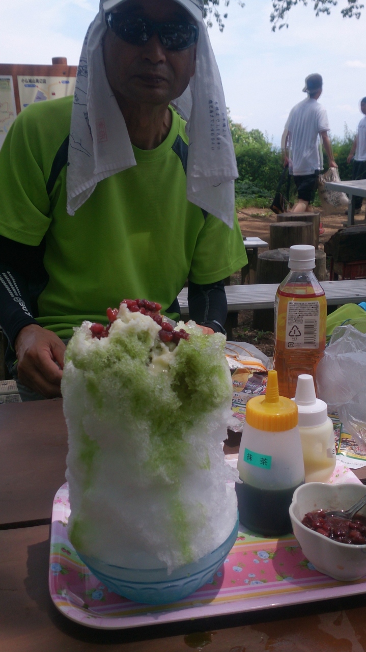 JR高尾から裏高尾経由で城山に向かう。暑い中、ひいこら上っていくと、おまちかねのかき氷が待っている。城山には茶店が二軒あるが、真ん中が東京と神奈川の境になっている。東京側でかき氷を注文、普通300円大400円、もちろん大のアヅキ抹茶ミルク、おじさんが丁寧に高くしてくれ、セルフでシロップ等をかける。体が冷えていい感じ。