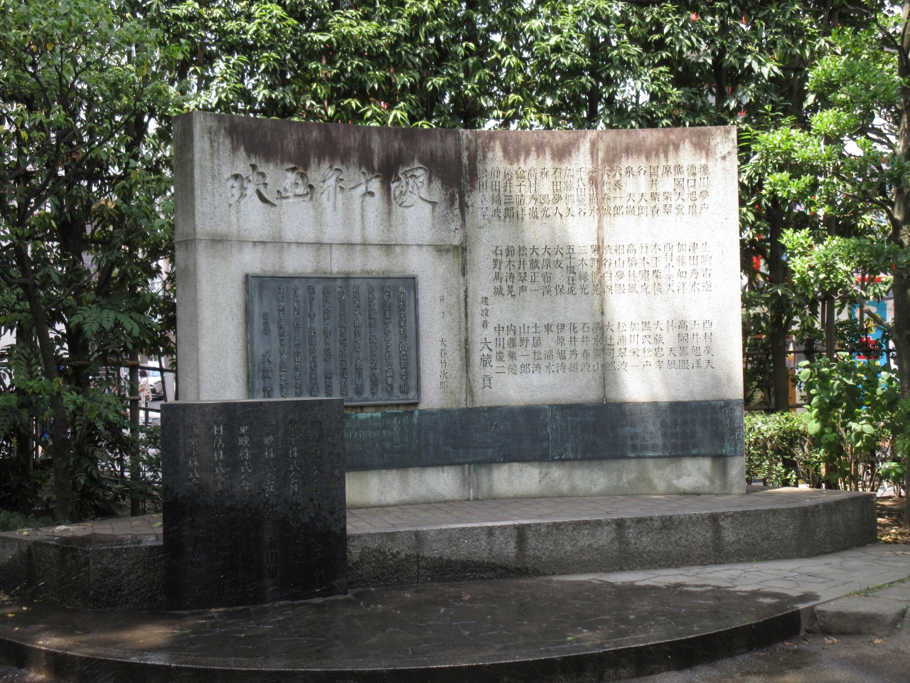 浅草寺境内西側、西参道近くにある新奥山の中にあります。植え込みや木々に囲まれた新奥山には石碑や記念碑が並んで立っていて、奥に喜劇人の碑と並ぶように映画弁士塚が立っています。無声映画の弁士の名前が彫られていて知っている名前もありました。各映画会社の連名もあり懐かしかったです。新奥山にはこのように明治以降の歴史を語る石碑があるので寄ってみて下さい。