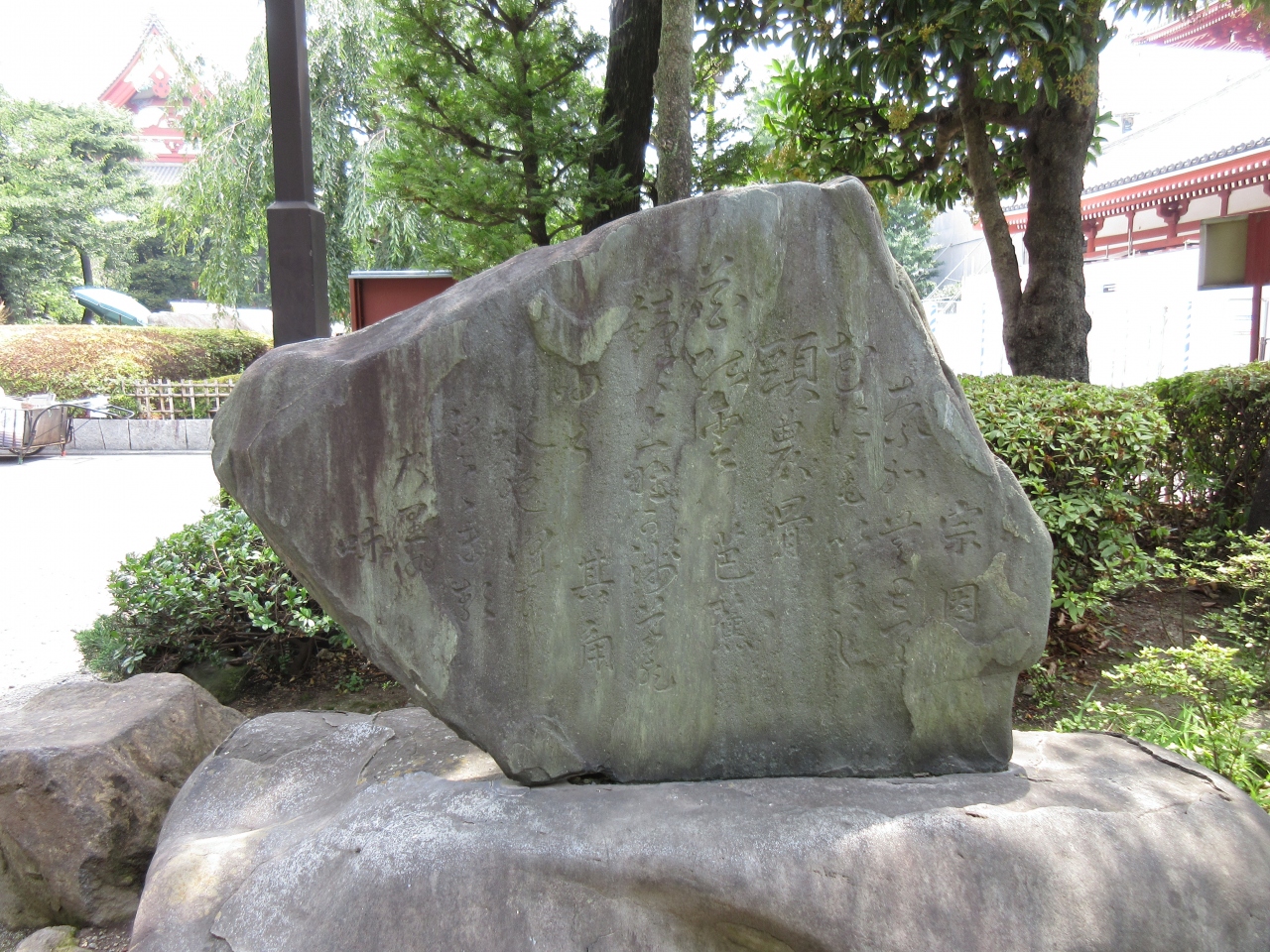 浅草寺境内西側、西参道近くにある新奥山の中にあります。新奥山には石碑や記念碑が並んで立っていて、植え込みのそばにある石に句が彫られています。西山宗因、松尾芭蕉、榎本其角の句です。説明板に記されていなければ読めなかったです。1809年に建立され1894年に移築されました。俳句に興味のある方はのぞいてみてはいかがでしょうか。新奥山には他にも歴史を語る石碑があるので寄ってみて下さい。