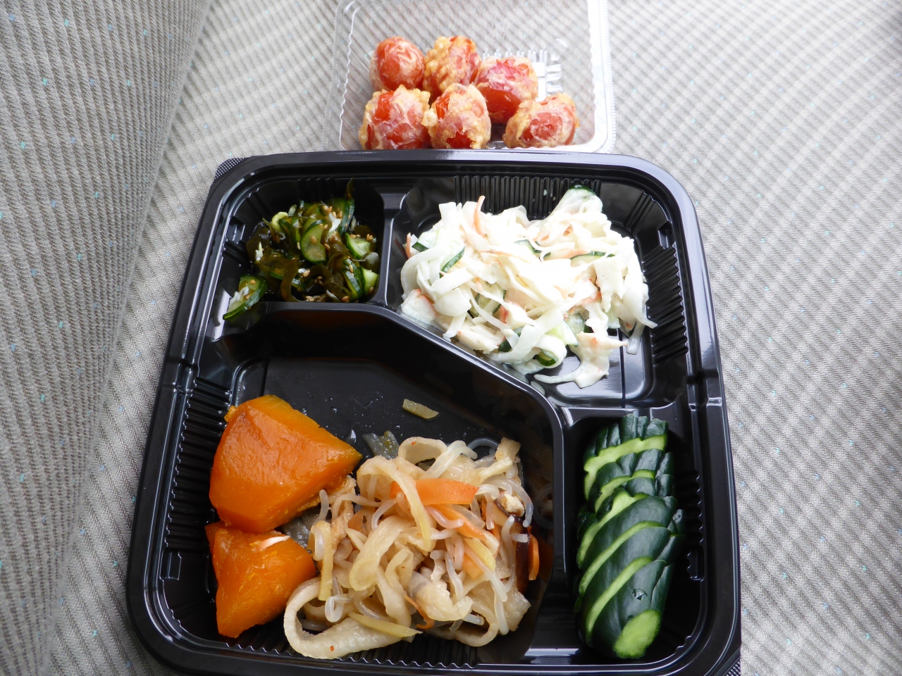 第二吹越駐車場に停め車中でいただきました。野菜コロッケ、肉コロッケは共にやさしい味付け。なめらかなじゃがいもにはほのかな甘みも感じられ、昔お肉屋さんで買って食べたような懐かしい味わい。唐揚げは生姜が効いています。ただ衣は少ししんなりしていました。副菜は春雨とカニカマのサラダ、きゅうりとわかめの酢の物、切干大根煮物、南瓜煮物、きゅうり辛子漬け、ミニトマトの天ぷらはサービスです。どれも家庭的な味付けで、きゅうりの辛子漬けはおいしかったです。