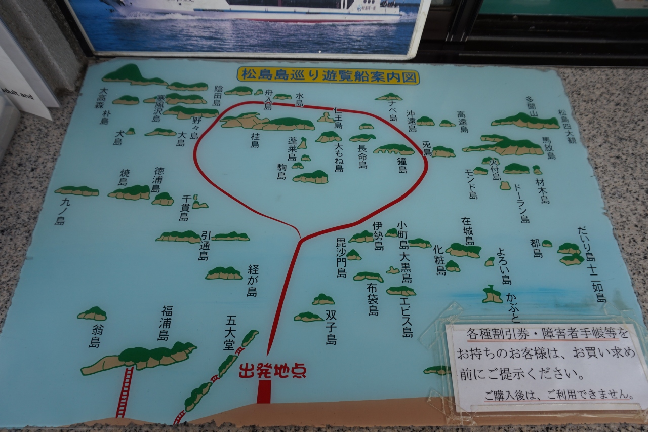 色々なコースの周遊船がありますが事前予約をしていなかったので、当日乗れるというコースにしました。松島湾1周の50分コースです。一人1500円でした。