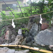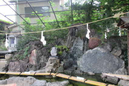 熊野神社の境内に厳島神社があります。名前の通り、広島宮島にある厳島神社を総本社とする神社です。とはいっても、小さなお社は小さい鳥居の正面ではなく左に隠れる様にあります。(案内の紙が貼ってあります)銭洗い弁天というと鎌倉の銭洗い弁天が有名ですが、ここもご祭神が水と財の神様である市杵島姫命(いちきしまひめのみこと)ですから、洗い場を設けて銭洗い弁天と名乗ることにした様です。岩肌を流れ落ちて溜まった、お金を清めるための宝池が社殿の並びにあります。熊野神社は、元々は西隣となる蓮馨寺の境内社の1つだったそうで、神仏分離により独立したとのことです。このお水は、その蓮馨寺にある宝池と同じ水脈から引いた由緒正しいものだそうです。なお、私の見た限りでは、蓮馨寺の境内では池が見つかりませんでした。昔あったということでしょうか。