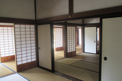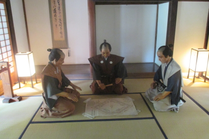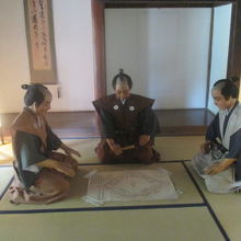 家老詰所ですが、往時は90m離れていたものが、すぐ裏側に移築されています。54坪ほどの大きさですが、トイレが2つもあるのに感心しました。家老は年寄りが多く、トイレが近かったのかななどと下らないことを思ってしまいます。ところで、この建物は明治6年(1873年)に民間に払い下げられ、昭和62年(1987年)まで民間の母屋として使用され、それを貰い受けて修理復元したのだそうです。回漕問屋として栄えた家に関係するところで使用されていたので、大きく傷むことがなかったのでしょうね。1室で絵図面(普請担当となった第2台場)を挟んで相談する3人が居ます。城代家老を中心に勘定奉行、普請奉行が資金繰りでも相談しているのでしょうか。