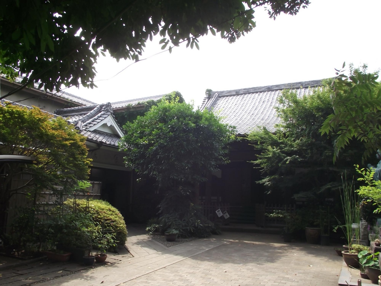 路地沿いにあるブロック塀の間のやや奥に大きくはないが立派な山門があり、緑に挟まれた参道を進むと左手に大木が、右手に本堂や庫裏などがあります。