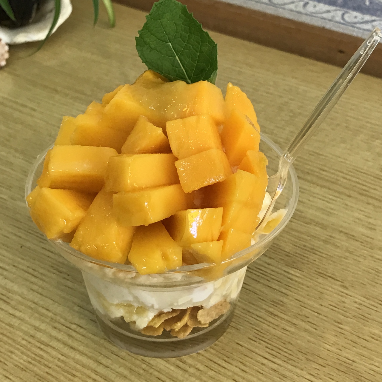 マンゴー、コーンフレーク、マンゴーシャーベット、マンゴーソースらしいが、マンゴーシャーベットが見当たりません。